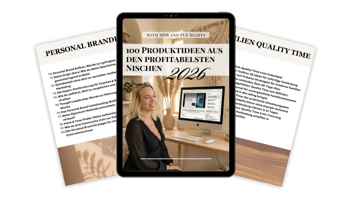Lass dich von meinen 100 profitablen Produktideen inspirieren und validiere dein Thema in unter 1 Stunde ohne wochenlange Recherche.