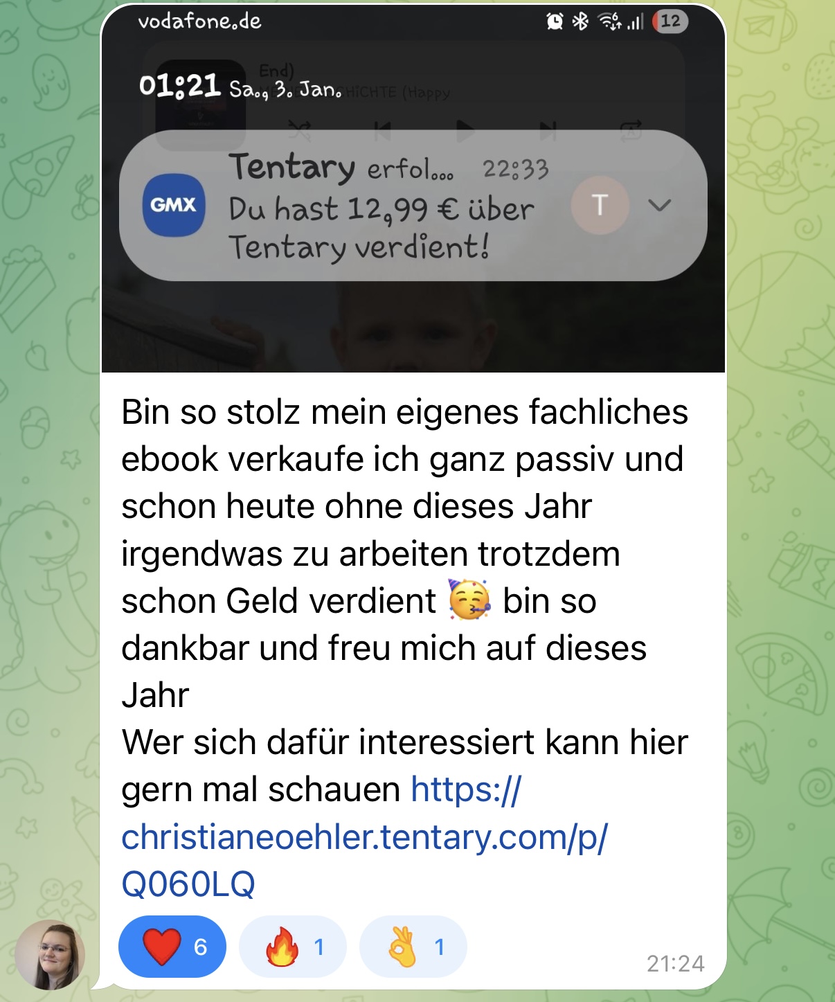 Ich hatte null Erfahrung mit digitalen Produkten ich wusste nicht mal, was ein Funnel ist. Nach 4 Tagen hatte ich mein erstes PDF fertig, nach 9 Tagen meinen ersten Verkauf. Ich habe digitalem Marketing eine Chance gegeben & es funktioniert wirklich. Vor allem mit den Schritt für Schritt Erklärungen von Jennifer